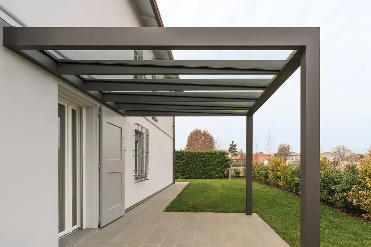 Pergolati in alluminio o acciaio zincato verniciati a polvere, copertura in PVC, policarbonato, pannelli coibentati, vetro stratificato.