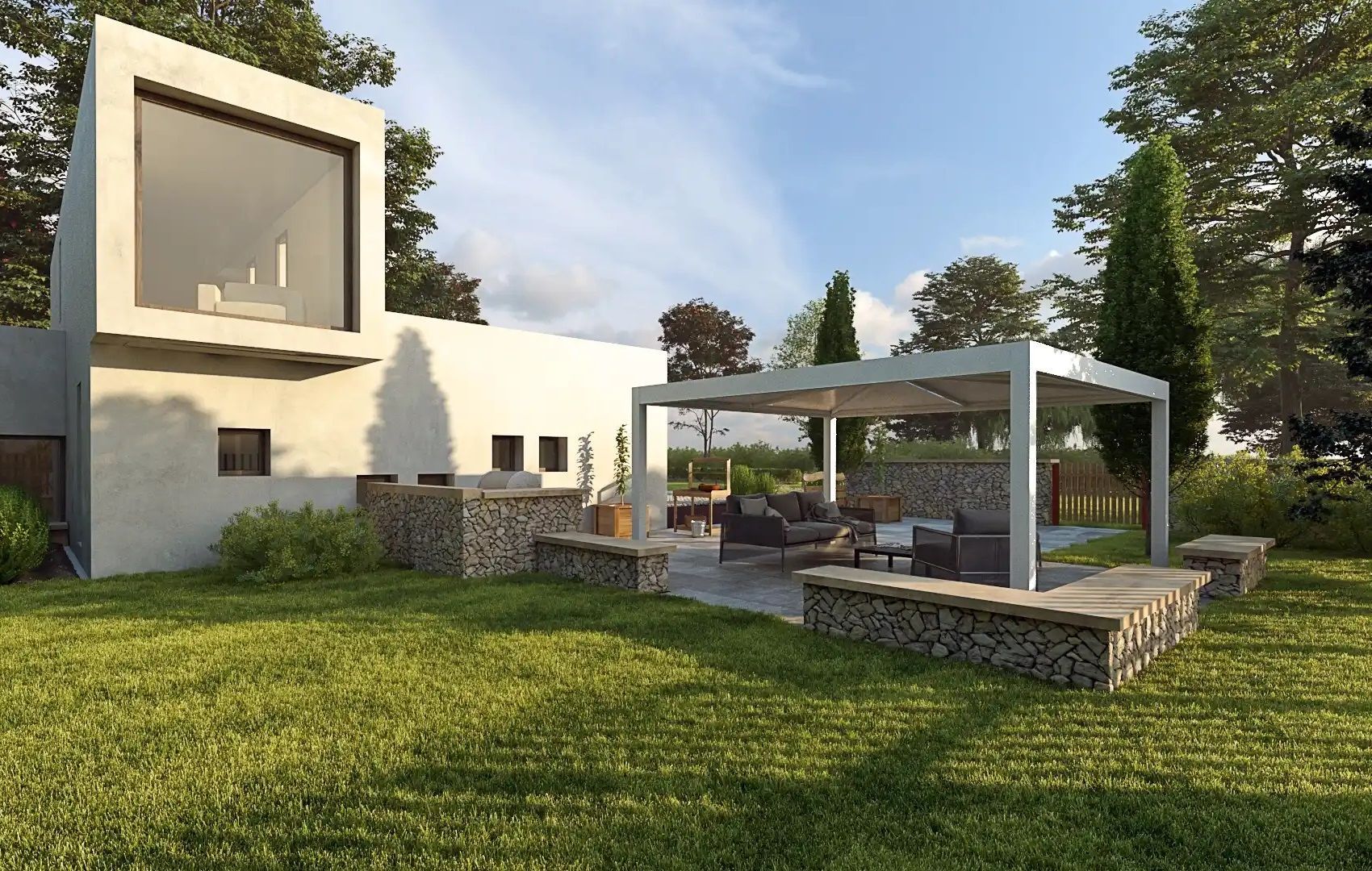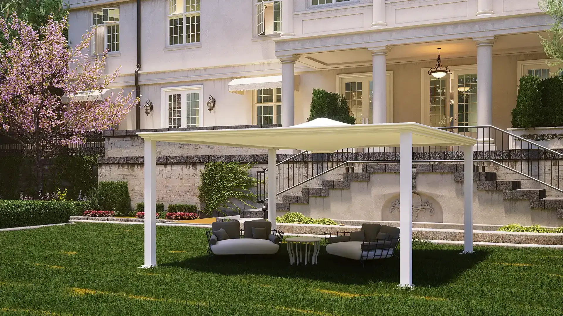 Gazebo con copertura in PVC triplo strato Maxcover a telo fisso o retrattile, struttura in acciaio zincato o alluminio verniciato a polveri.